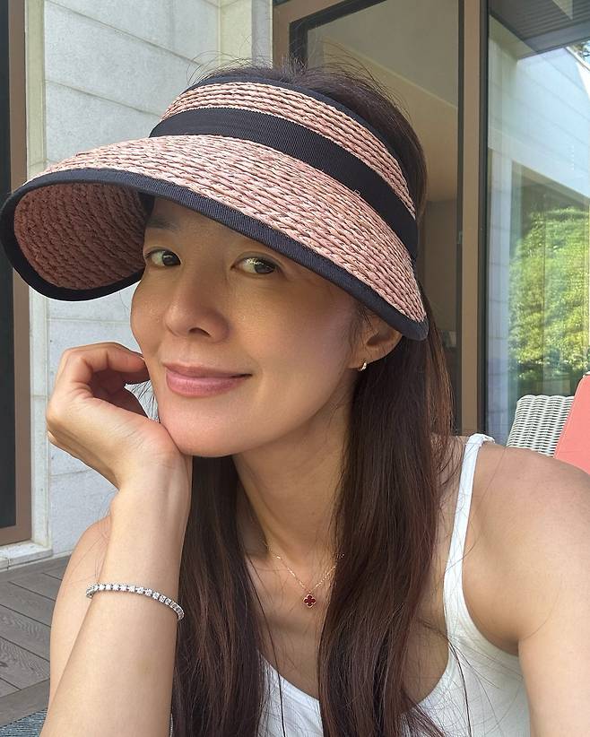햇살이 비치는 테라스에서 김성은은 화이트 슬리브 톱에 자연스러운 선바이저를 매치해 산뜻한 여름 무드를 보여주었어요