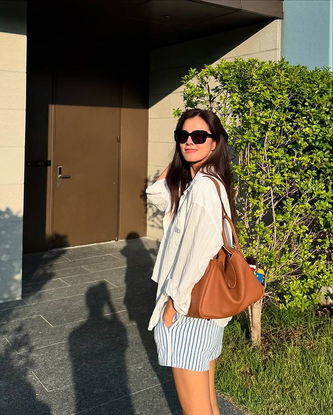 이어지는 사진에서는 스트라이프 쇼츠와 루즈한 셔츠, 브라운 가방을 더한 데일리룩이 눈에 띄었어요.