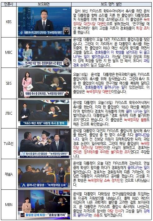 졸업생의 입장이나 과잉경호에 대한 지적은 없었으며, "해당 참석자는 녹색정의당 대전시당 대변인으로 알려졌다"며 사건과 관련 없는 당적을 언급했습니다. 조선일보·중앙일보·한국경제도 하나같이 윤 대통령의 이공계 공약을 강조하며 과잉 경호 문제는 행사장의 작은 소란 수준으로 보도했는데요. 주의 깊게 살펴보지 않으면 알 수 없을 정도로 기사 말미에 언급하는 수준에 그쳤습니다.