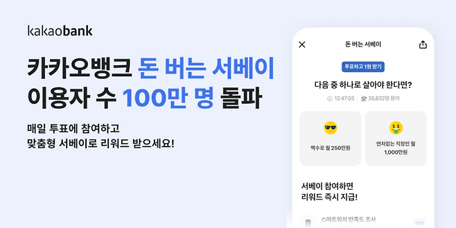 카카오뱅크는 앱테크 서비스 '돈 버는 서베이'가 누적 이용자 100만 명을 돌파했다고 23일 밝혔다.