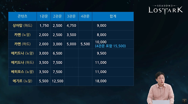 ■ 3월 21일 라이브 방송 내용 간단 요약- 1,640 구간 골드 보상 하향 조정 ㄴ 골드값이 떨어진 이유는 생산/소비의 불균형 ㄴ 1,640 구간에서 생산되는 골드가 전체의 절반이다 ㄴ 1,640레벨이 올리는 난이도 대비 버는 골드가 많다 ㄴ 다음 주 업데이트를 통해 1,640 구간 골드 보상을 하향 조정한다 ㄴ 상하탑부터 노기르까지(싱글 포함) - 골드 보상 조정에 따른 성장 완화 ㄴ 상급 재련 1~2단계 ㄴ 무기/방어구 초월 비용 ㄴ 재련 재료, 재련 골드 비용 대략 50% 감소 ㄴ 초월 비용은 30% 감소 예정 - 보호자 문제 ㄴ 콘텐츠 이용에 보호자가 권장되는 상황 ㄴ 골드, 성장 완화 추이를 보고 방침을 정할 예정 ㄴ 자연스럽게 비중이 바뀌는 것을 유도할 예정 - 나이스 단(중복 캐릭터 원정대 육성 이슈) ㄴ 보석이 문제다 ㄴ 돌려쓰기 제한, 보석 변환 비용 무료, 프리셋에 따라 변환 등 ㄴ 다양한 대안을 논의를 통해 결정 ㄴ 재미가 아닌 보석 비용 절감을 위해 중복 캐릭터를 육성하게 하지 않을 것 - 큐브 파견 회수 이슈에 대해 ㄴ 시즌3 초반에 발견한 오류를 한참 뒤에 회수 ㄴ 큐브 직접도는 게 낫도록 버그만 수정하고 적당히 넘어가려 했다 ㄴ 지금 다시 생각해도 잘못된 판단, 송구스럽다 ㄴ 보다 나은 게임 서비스를 위해 발전할 수 있도록 노력하겠다 - 밸런스 업데이트에 관해 ㄴ 지난 5주년 방송에 언급한 꾸준한 패치 방침은 동일하다 ㄴ 다만, 콘텐츠 업데이트 시기나 콘텐츠 특성에 따라 업데이트가 밀릴 수 있다 ㄴ 2월 말 밸런스 업데이트가 늦은 것은 이런 이유 ㄴ 밸런스 업데이트 이후 현재는 비교적 안정적 ㄴ 다음 밸런스 업데이트는 구조 개선 위주로 진행 예정 - 에스더 무기 재련 효과 도감화 ㄴ 재련 이펙트 도감화와 동일한 방식 ㄴ 에스더 무기 외형으로 보이는 진화 단계 선택 가능 ㄴ 에스더 무기 성장 경험치 삭제 고려중 - 심연의 폭풍 이벤트 부족한 것 인지. 다음엔 더 노력할 것- 증명의 전장 신규 시즌 ㄴ 4월에 신규 시즌 준비 중 ㄴ 투혼전 중심이 될 것 ㄴ 관련 시스템 추가, 밸런스 조정 예정 ㄴ 어뷰징 방지를 위한 모니터링 시스템 강화 예정 - 서버 이전 추가 고려 중- 피시방 이벤트 기간 문제 ㄴ 이벤트 기간 10주로 늘릴 예정 - 필드 보스 리셋 관련 ㄴ 이제 필드 보스가 리셋되어도 체력은 유지 ㄴ 세베크 아툰은 체력 조절 ㄴ 카운터 시 약화되는 방향으로 클리어 시간을 단축시킬 것 - 드렉탈라스 ㄴ 체력 하향 조정 ㄴ 불편한 부분 인지 중. 개선 관련해 살펴볼 예정 - 싱글 모드 ㄴ 겨울 업데이트로 긍정적 반응 많다 ㄴ 앞으로도 계속 하겠다 - 카드 ㄴ 고급 희귀 등이 구하기 어려워진 상황 ㄴ 구하기 어려운 등급 카드의 공급처를 늘릴 계획 - 신규 헤어 ㄴ 다음 헤어는 미리 준비하겠다 ㄴ 단발, 파후 헤어를 고려 중 - 연출 스킵 ㄴ 공대장이 관련 설정으로 연출스킵방을 만드는 식으로 개선 고려 중 ㄴ 퀘스트와 동일하게 스킵이 가능한 방향도 ㄴ 적절한 방법으로 개선 예정 - 보기 힘든 스펙 문제 ㄴ 보기 좋게 요약해 볼 수 있도록 UI 개선 ㄴ 팔찌/장신구 상/하옵 구분 색 표시 추가 예정 - 패키지 마일리지는 현재 마일리지 보상 부분이 포함된 가격이다- 서포터는 밸런스 업데이트 때 적극 개선해보겠다- 강습 레이드 ㄴ 4인은 매칭으로도 클리어 가능 ㄴ 8인은 부담 없는 난이도 ㄴ 4인 노말 1,660/1,700, 8인 1,680/1,720 동일 ㄴ 각각 주간 1회 입장 가능 ㄴ 골드 보상은 노말 1만, 하드 1.8만 ㄴ 강습 보물상자에서 최대 50만 골드(하드 기준) 랜덤 보상 획득 가능 ㄴ 랜덤 유물 각인서가 확정 드롭 ㄴ 8주 동안 진행되는 한정 레이드 - 4월 2일 모코코의 생일 이벤트 ㄴ 모코코 씨앗을 '키워바바' ㄴ 생일 이모티콘 팩, 굿즈 선물과 팬키트까지 ㄴ 꿀꽈배기와 콜라보레이션 세트 판매 예정 - 종막 : 카제로스 ㄴ 잘 준비되고 있다 ㄴ 굉장하다 ㄴ 레온하트에서 시작한 7년 여정의 종지부다 ㄴ 레이드 제작 노하우를 집대성, 최고의 작품을 만들 것 진짜 쉬운 거 맞다! 강습 레이드 소개 다음 주 추가될 강습 레이드의 모습이 다시 한번 공개됐다. 레벨은 기존과 동일하게 4인/8인 2개 콘텐츠로 구성되어 있으며 4인은 노말 1,660/하드 1,700레벨이다. 8인은 1,680/1,720레벨이다. 전재학 디렉터는 '쉽다'는 것을 계속 강조했는데, 4인 던전은 매칭으로도 클리어가 가능한 수준이며, 8인도 부담이 없는 난이도라 평했다.