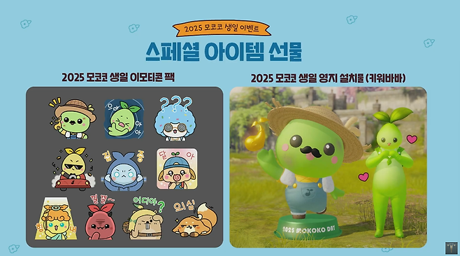 4월 2일 모코코 생일 이벤트 시작! 4월 2일부터는 모코코의 생일을 기리는 이벤트도 시작된다. '모코코의 씨앗을 키워바바'라는 이름처럼, 새로운 모코코 NPC 키워바바가 등장한다. 이벤트에서는 생일 이모티콘 팩, 영지 설치물, 굿즈 선물과 팬키트 등 다양한 보상을 받을 수 있다.