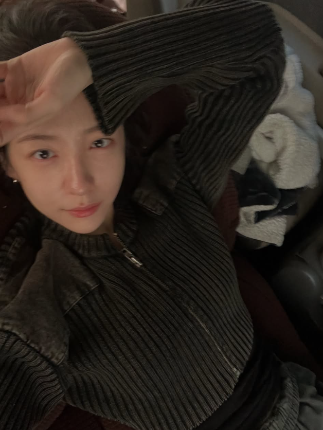 또 다른 일상룩에서는 올블랙으로 캐주얼한 패션을 완성했는데요. 검은색 골지 집업에 밴딩 팬츠로 편한 옷차림이었어요.