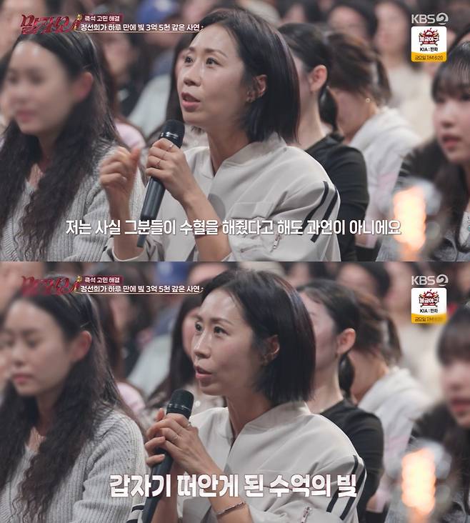 은인들을 언급하면서 정선희는 "그분들이 조금씩 수혈을 해줬다고 해도 과언이 아니다"라고 말문을 열었다. 그는 갑자기 떠안게 된 수억의 빚으로 절망적인 상황이었을 당시, 개그맨 동료들이 수억원을 모아줬다고 했다.