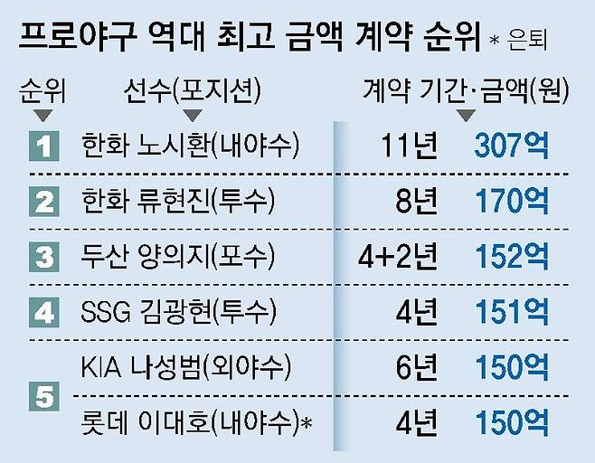 한화는 애초부터 최정의 계약 총액을 넘어서는 금액을 정해 놓고 계약 기간을 고민했다. 한화 관계자는 “계약 총액에 노시환이 최정을 넘어서는 선수가 돼주기를 바라는 상징성을 담았다”고 설명했다. 노시환과 한화는 21일 계약 조건에 합의한 뒤 22일 오키나와현의 한 호텔에서 계약서에 서명했다.