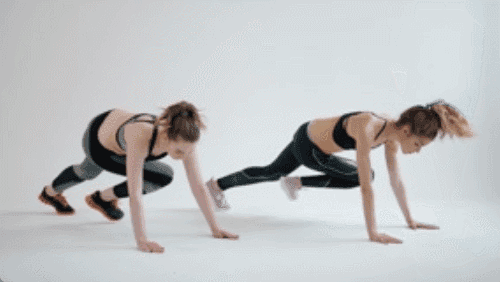 매트에 플랭크 자세로 엎드립니다. 오른쪽 무릎을 왼쪽 팔꿈치 방향으로 당겼다가 돌아갑니다. 왼쪽 무릎을 오른쪽 팔꿈치 방향으로 당겼다가 돌아갑니다. 크로스 방향으로 반복 운동합니다.