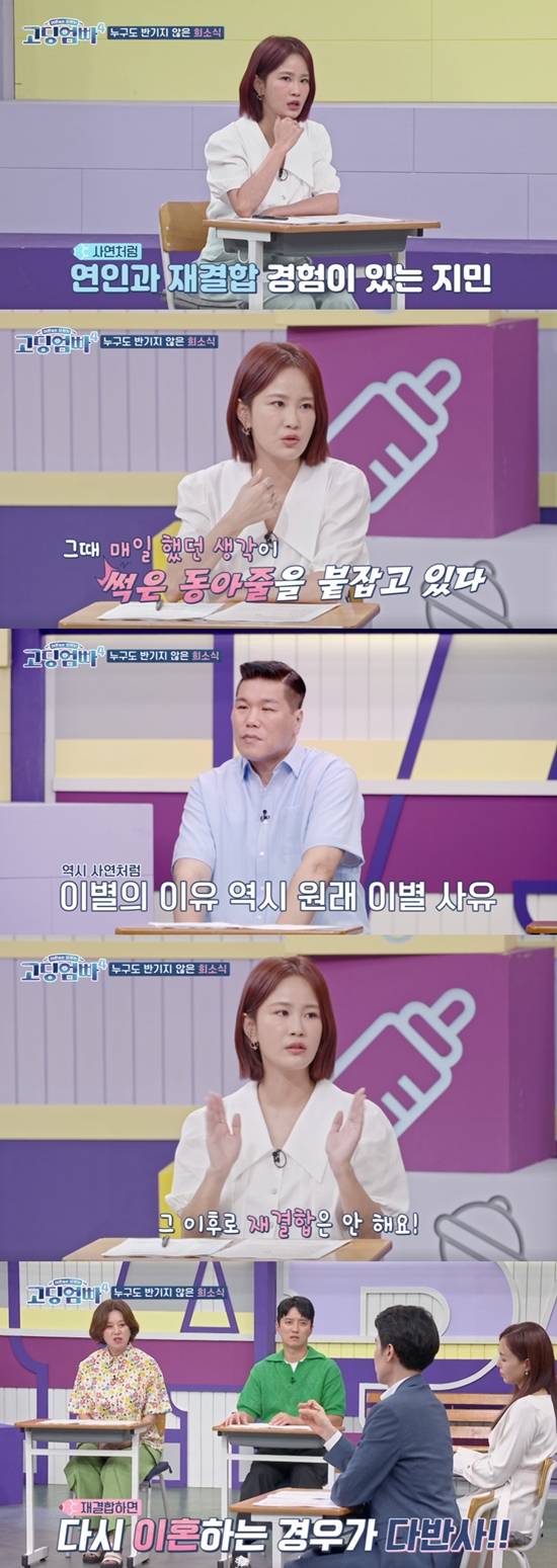 이를 스튜디오에서 지켜보던 김지민은 연인과 재결합 했던 경험을 공유했다. 그는 "제 주변에도 그렇고 저도 재결합한 경험이 있다. 그때 '썩은 동아줄을 붙잡고 있다'는 생각을 매일 했다"고 토로했다.