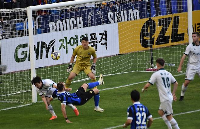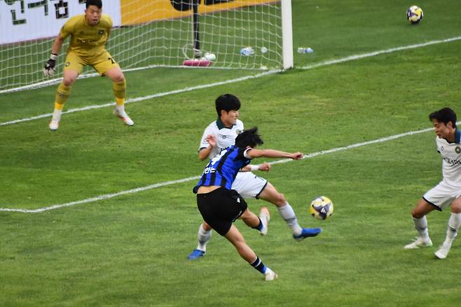 | ▲ 전반 11분, 김포 FC 루이스가 인천 유나이티드 FC 골문을 위협하는 오른발 중거리슛을 날리는 순간. |