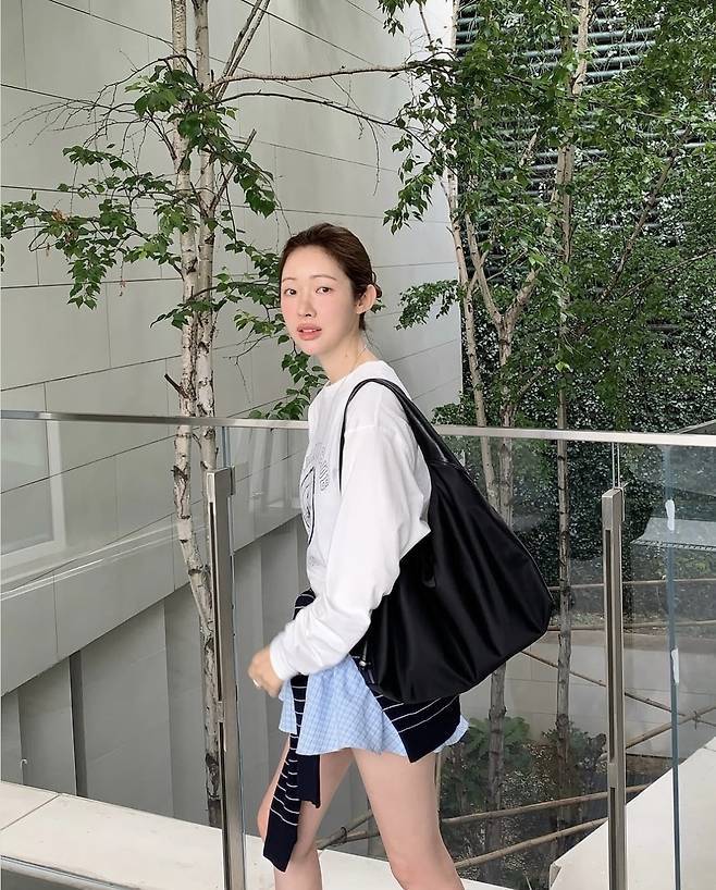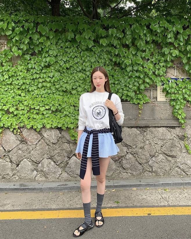 프린트 맨투맨에 하늘색 체크 셔츠를 레이어드 한 듯 연출한 미니스커트에 스트라이프 카디건을 허리에 묶어 캐주얼하면서도 감각적인 실루엣을 완성했습니다.