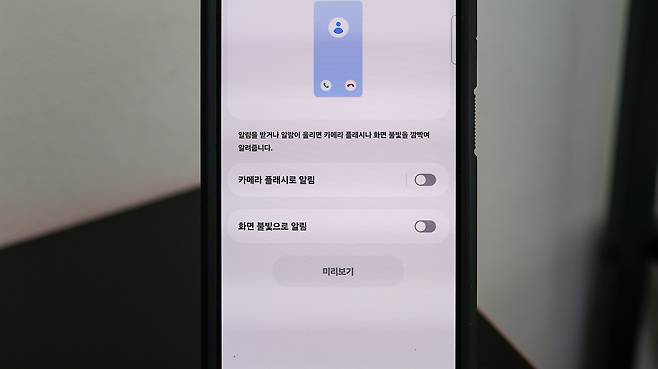 - 카메라 플래시 알림: 뒷면 플래시가 짧게 깜빡이고