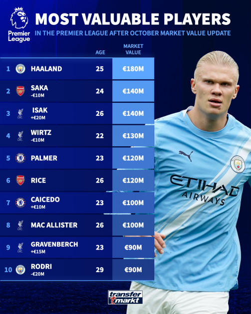 비르츠의 몸값이 재조정된 가운데 프리미어리그에서 현재 가장 비싼 가치는 엘링 홀란(맨체스터 시티)이다. 홀란은 1억 8천만 유로(약 2,986억 원)로 지난 평가에서 변동이 없었다. 그래도 1위를 굳건히 지켰다.