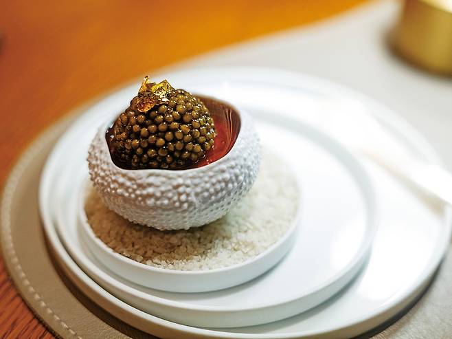 만다린 오리엔탈식 환대의 절정은 미식에 있다. 첫 경험은 랜드마크 M.O.에 자리한 프렌치 다이닝 앰버(Amber)에서 시작했다. 미쉐린 2스타와 그린 스타를 획득한 이 레스토랑은 파인다이닝의 메카로 불려도 손색없는 홍콩에서 미디어, 가이드북, 미식가가 앞다퉈 칭송하는 명소다. 올해로 이곳을 20여 년째 이끄는 총괄 셰프 리처드 에케버스(Richard Ekkebus)는 종종 ‘피에르 가니에르에게 사사받은’이라는 문구로 소개되지만 이제는 그와 어깨를 나란히 하는 거장이다.