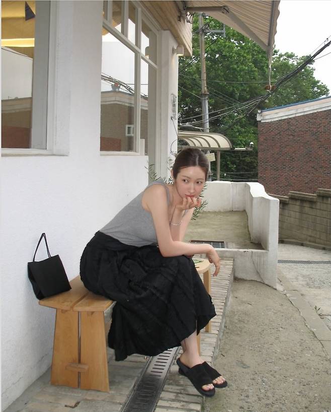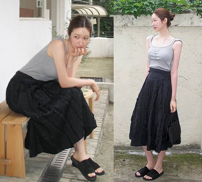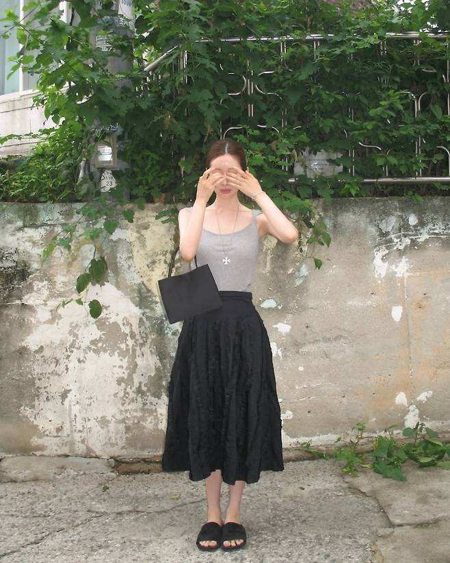 차정원은 몸에 자연스럽게 밀착되는 슬림한 그레이 민소매 탑에, 풍성한 주름 디테일이 돋보이는 블랙 롱스커트를 매치해 여름에도 시크함을 잃지 않는 스타일링을 선보였습니다.