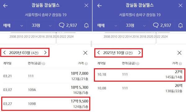 송파구 주요 대단지에서도 비슷한 현상이 일어났다. 잠실동 ‘잠실엘스’는 2020년 3월 17억9500만원(5층)에 팔렸지만, 2021년에는 10억원대 거래가 발생하지 않았다. 2021년 10월 27억원(14층)에 팔리면서 1년 반 사이 10억원 가까이 올랐다.
