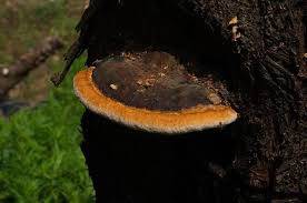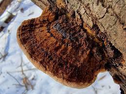울퉁불퉁하고 짙은 갈색의 나무 위 버섯을 발견했습니다.