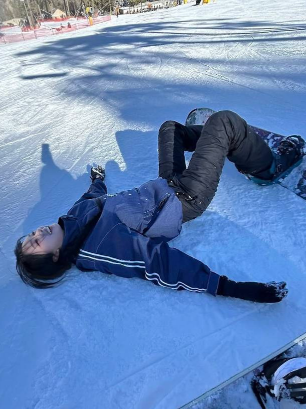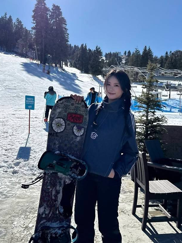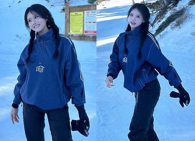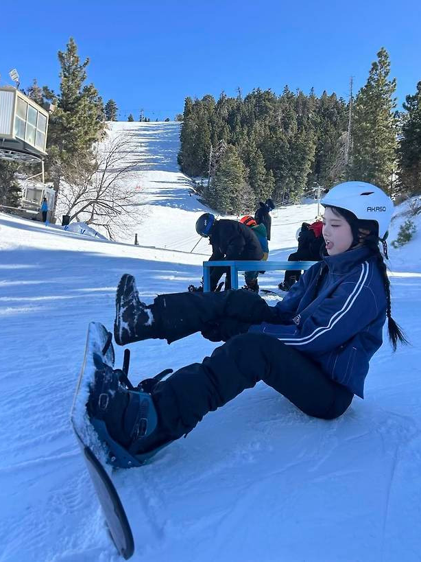 이재시는 스노우보드 장비를 완벽히 갖추고 겨울 스포츠룩을 선보이며 청량한 매력을 발산했습니다.