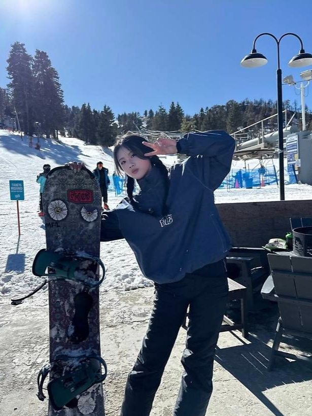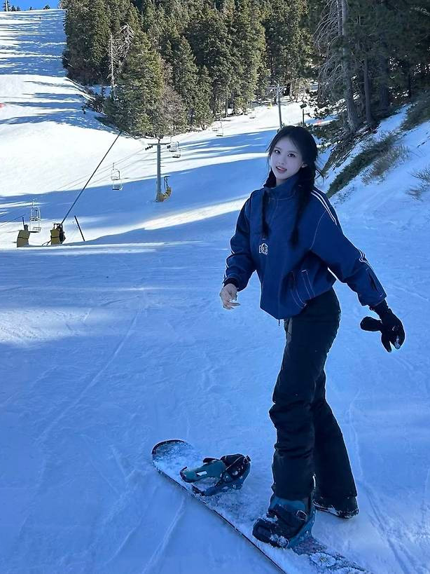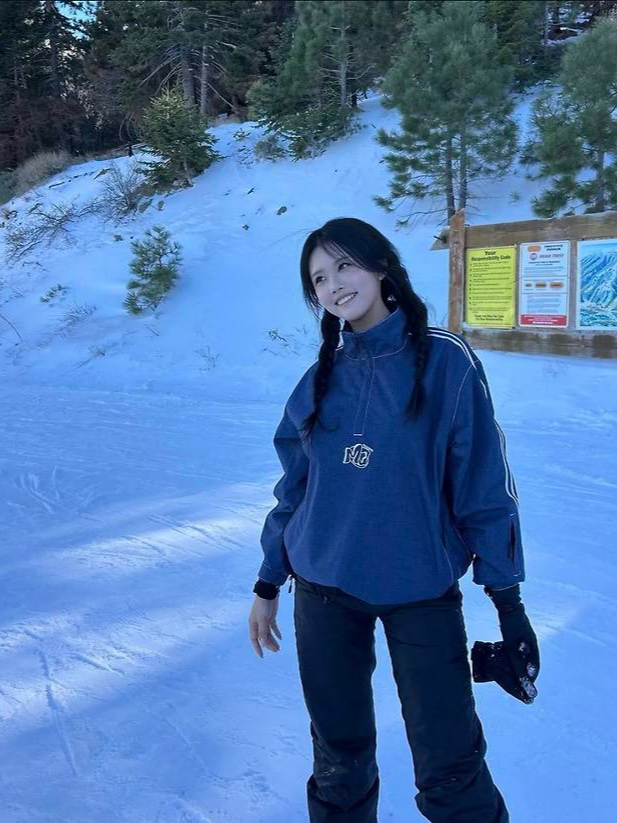 네이비 컬러의 하이넥 아노락과 블랙 보드 팬츠를 매치해 활동성을 강조한 스타일은 눈밭에서도 돋보이는 실용적이면서 세련된 룩을 완성했습니다.