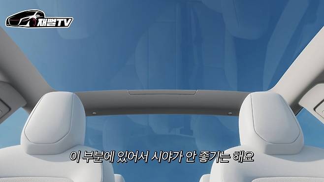 머리가 지금 거의 천장 유리에 닿을락 말락 하거든요. 그래서 살짝 헤드 레스트에 기대면 썬루프 중간 지지대에 시야가 걸려요. 만약에 키가 작거나 하면 상관이 없는데, 모델 Y는 위에가 전부 다 유리로 돼 있잖아요. 그렇게 돼 있으면 개방감은 되게 뛰어날 것 같아요.