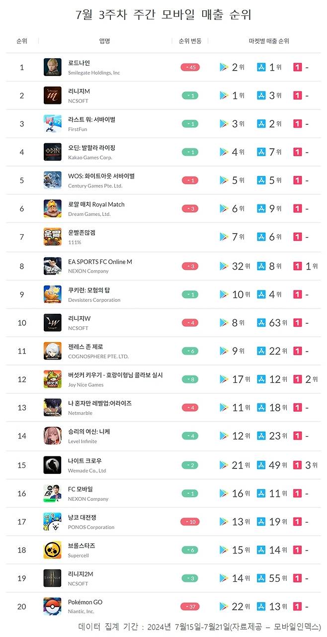 한 주간의 매출 순위를 알아보고 국내 모바일 게임 시장에 어떤 변화가 있었는지 확인하는 '주간모바일순위' 코너입니다. 구글 플레이와 애플 앱스토어, 원스토어 등 국내 3대 마켓에서의 모바일 게임 매출을 합산해 산출한 순위를 통해 매주 모바일 게임 시장 변화를 독자들에게 제공하고자 합니다. <편집자주>