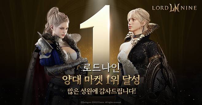 '로드나인'은 지난 7월15일부터 21일까지의 데이터를 집계해 산출된 7월 3주차 모바일 매출 순위에서 지난주(46위) 대비 45계단 상승해 1위에 올랐다. 출시 직후 애플 앱스토어 매출 1위를 기록한 데 이어, 19일 구글 플레이에서도 매출 1위를 달성했다.