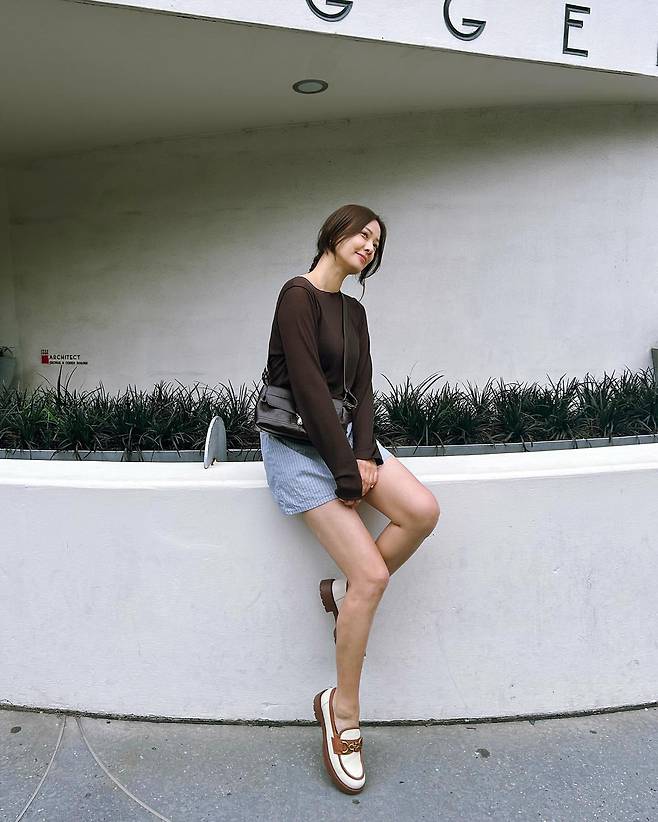 손태영은 브라운 톤 긴팔 상의와 스트라이프 패턴의 하늘색 반바지를 매치한 룩을 선보이고 있다. 심플한 디자인의 상의와 경쾌한 느낌의 반바지 조합으로 편안하면서도 세련된 분위기를 연출하고 있다. 여기에 화이트 컬러가 가미된 브라운 로퍼를 매치해 전체적인 조화를 이루며, 크로스백을 자연스럽게 착용해 실용성까지 더했다.