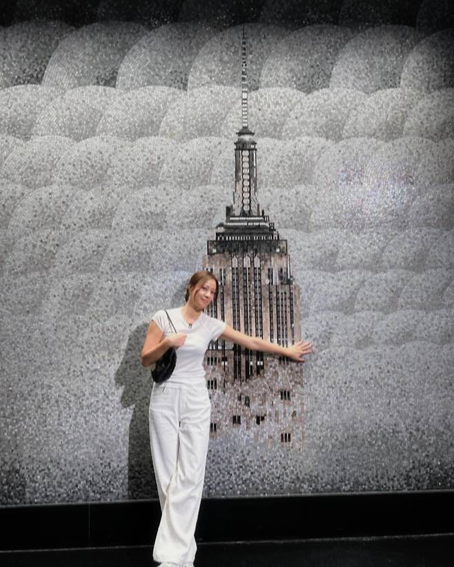 심플한 화이트 티셔츠와 와이드 팬츠를 매치한 올 화이트 룩을 선보이고 있다. 모노톤 의상으로 깔끔하고 세련된 이미지를 연출하며, 블랙 숄더백으로 포인트를 주었다. 뒤편의 엠파이어 스테이트 빌딩 모티프 월아트와 대비되어 더욱 돋보이는 스타일링으로, 미니멀리즘의 정수를 보여주고 있다.