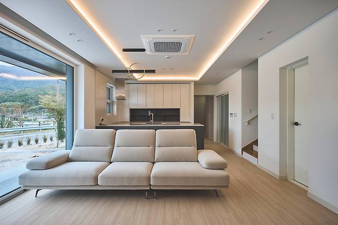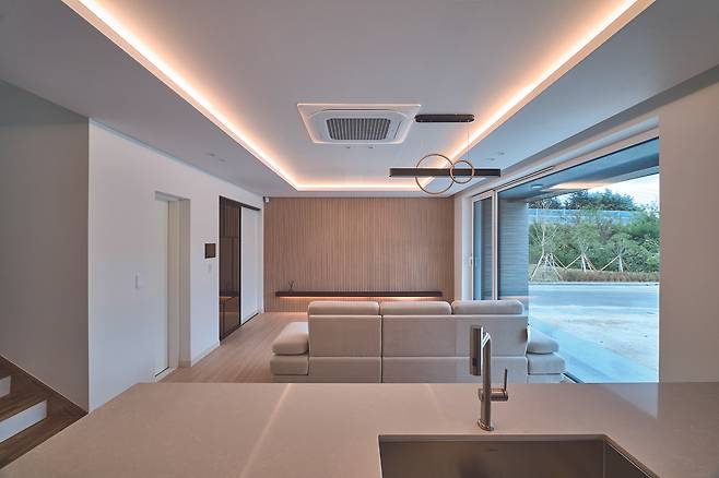 1층의 경우, 현관에서 진입 후 펼쳐지는 거실, 주방, 식당(LDK)을 한 공간으로 넓게 구성했다. 또한, 거실과 마당의 연결뿐만 아니라 안방에 전용 정원을 배치해 두 공간을 연계했다.