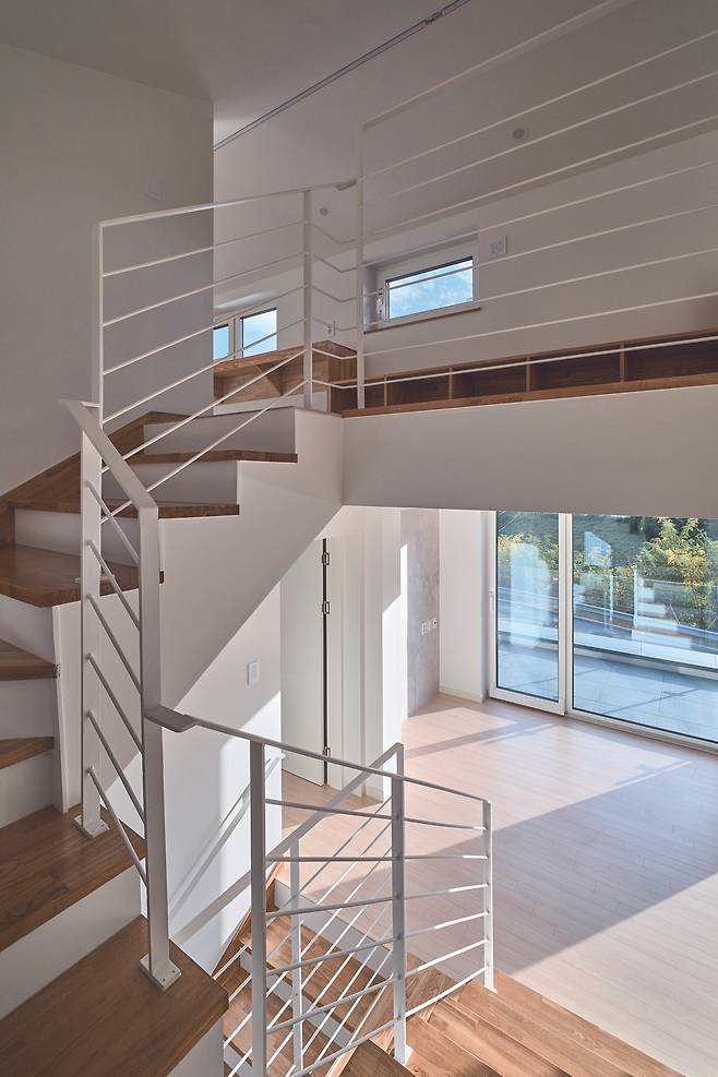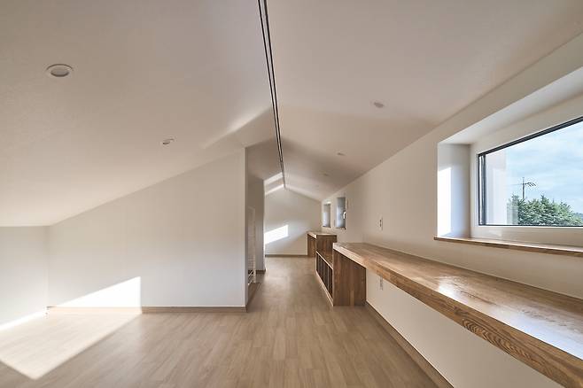 2층은 자녀방을 양 끝단에 놓고 코너창을 계획해 멀리 보이는 산의 능선을 창에 담고, 가족실을 중심으로 넓은 베란다를 구성해 외부 공간에 나가 주변을 조망하며 자연을 만끽할 수 있도록 했다. 아울러 지붕 아래에 아늑한 다락을 길게 형성하고, 계단실을 중심으로 좌우의 공간이 벽으로 구획되지는 않지만 각각의 영역성을 가질 수 있게 했다. 각각의 다락 공간을 다른 성격으로 이용할 수 있도록 해 건축주가 취미생활을 즐기거나 휴식, 수납 등을 도모할 수 있도록 계획한 것이다.