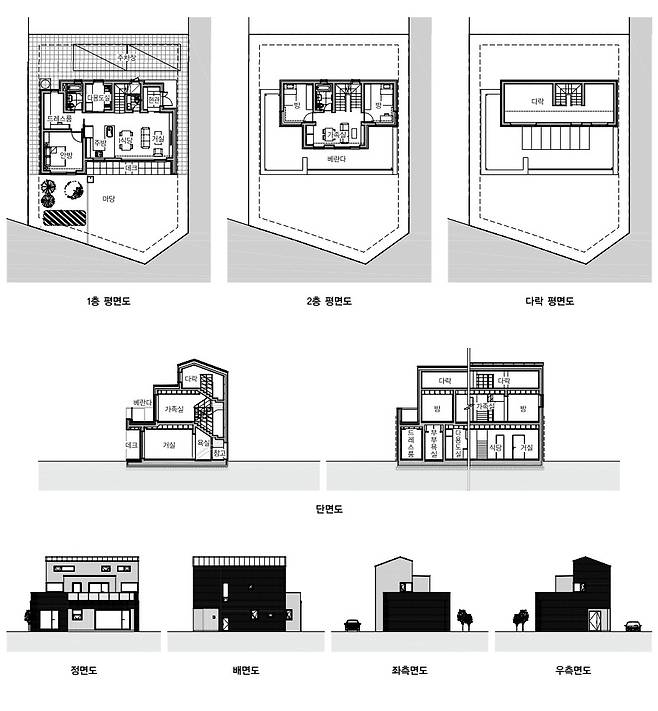 아파트 생활을 뒤로하고 주택의 삶을 선택한 건축주를 위해 단독주택만의 매력을 느낄 수 있는 공간을 고민하는 것에서 프로젝트를 시작했다. 아파트와 다른 주택만의 공간은 외부공간과의 관계에 있다고 생각했다. 이에 1층에는 마당, 2층에는 건물이 셋백되며 형성되는 베란다 그리고 지붕 아래에 다락이 들어서는 공간 구성을 계획했다. 이러한 구성을 통해 아파트에서는 경험할 수 없는 주택에서의 공간감을 제공하고자 했다.