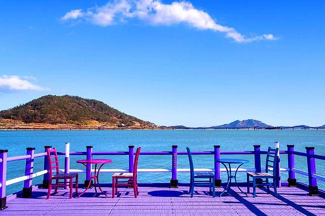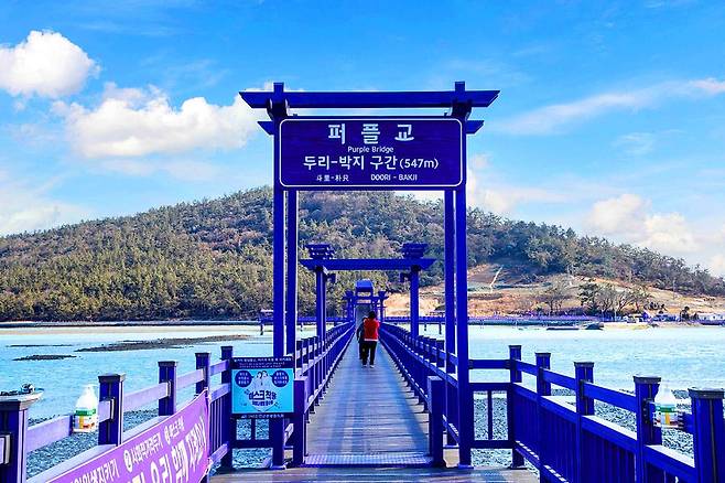 반월도와 박지도, 두 개의 섬을 연결하는 해상목교 ‘퍼플교’는 바다 위를 걸어보는 이색 체험을 할 수 있습니다.
