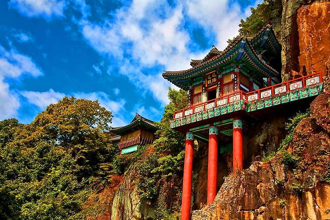 사성암은 절벽 위에 절이 있는 독특한 곳으로 가을이 되면 주변이 단풍으로 물들여져 화려한 풍광이 펼쳐지는 자연 문화 명소입니다.