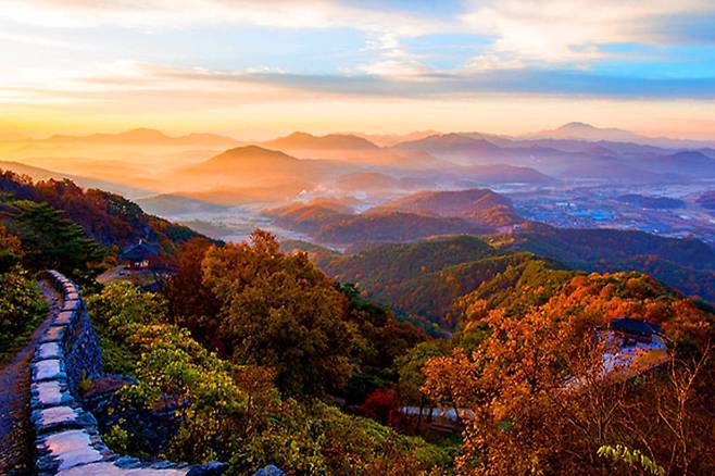 금성산성은 가을 단풍이 무성하게 물들여진 절경을 내려다볼 수 있는 문화 명소입니다.