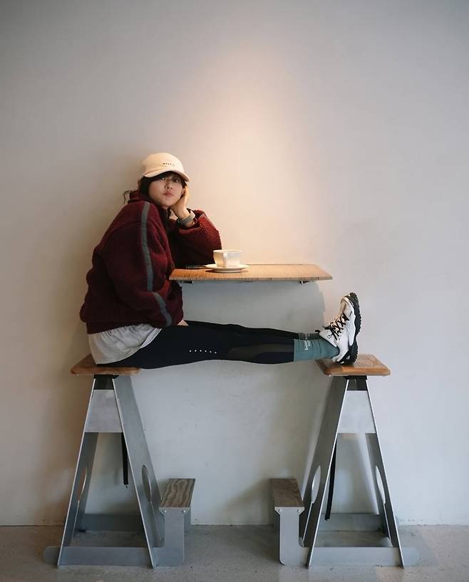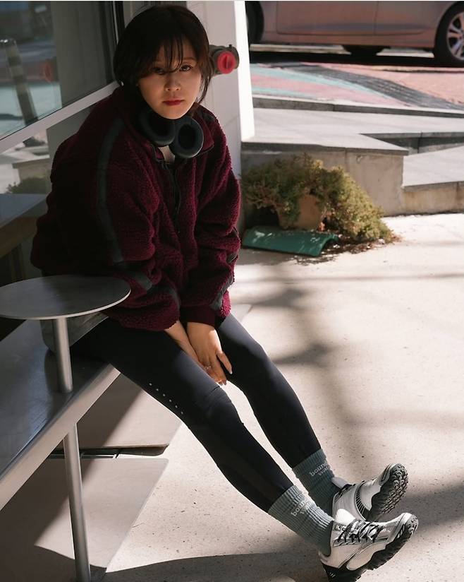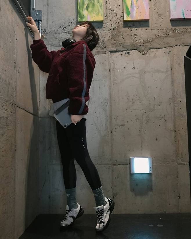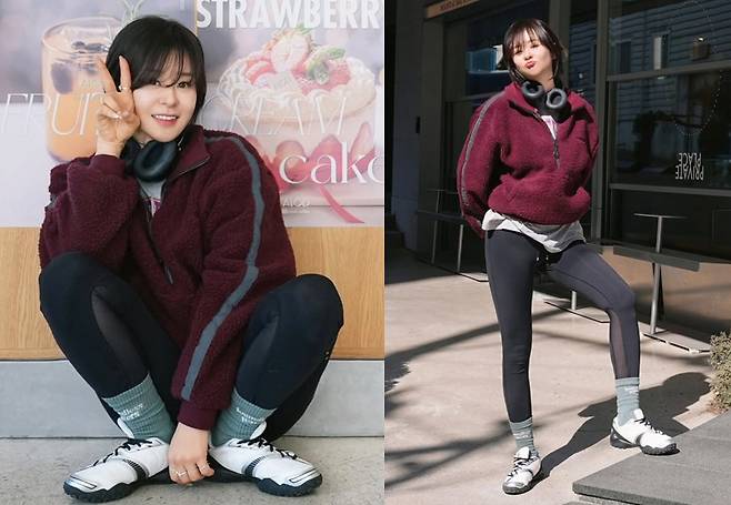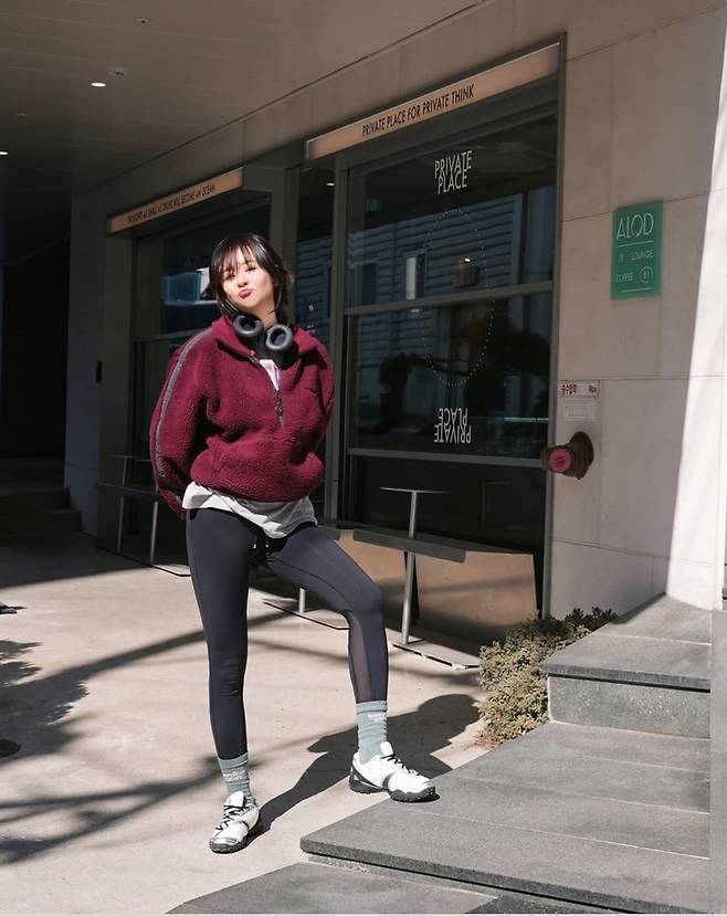 살짝 루즈한 핏의 플리스가 귀여운 분위기를 더하는 동시에, 슬림한 레깅스가 건강한 이미지를 더욱 강조했습니다.