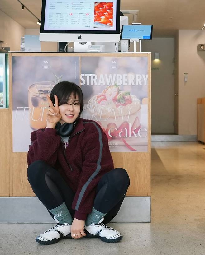 최강희는 와인 컬러의 플리스 집업에 블랙 시스루 레깅스를 매치해 편안하면서도 트렌디한 스타일링을 완성했습니다.