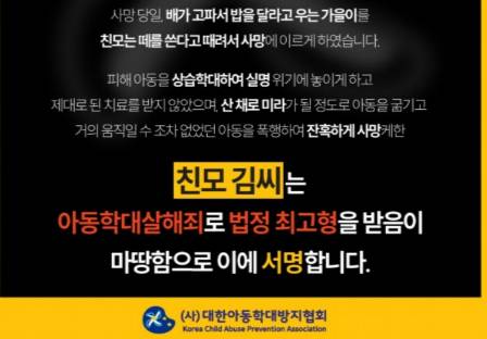 이 같은 이유로, 대한아동학대방지협회는 "동거인 최수빈씨 역시 '아동학대 살해에 대한 공동정범(2인 이상이 공동으로 범행을 저지르는 것)'으로 처벌하는 게 마땅하다"고 했습니다. 그러면서 중요한 얘길 했습니다. "관대한 처벌은 아동학대를 방조하는 것이다. 강력한 처벌이야말로 가해자들에 대한 엄중한 경고다."