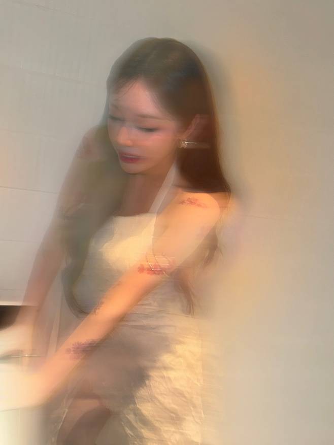 실키한 질감의 화이트 슬립 드레스는 몸을 따라 부드럽게 흐르며, 그녀의 여리여리한 실루엣을 더욱 부각시키고 있어요.
