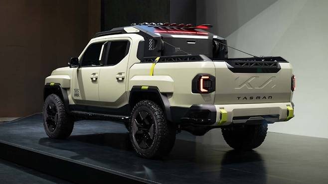 전면부는 블록형 그릴과 입체적인 범퍼 디자인으로 존재감을 강조하며, ‘TASMAN’ 레터링과 기아의 신형 로고가 차량의 정체성을 명확히 드러낸다.