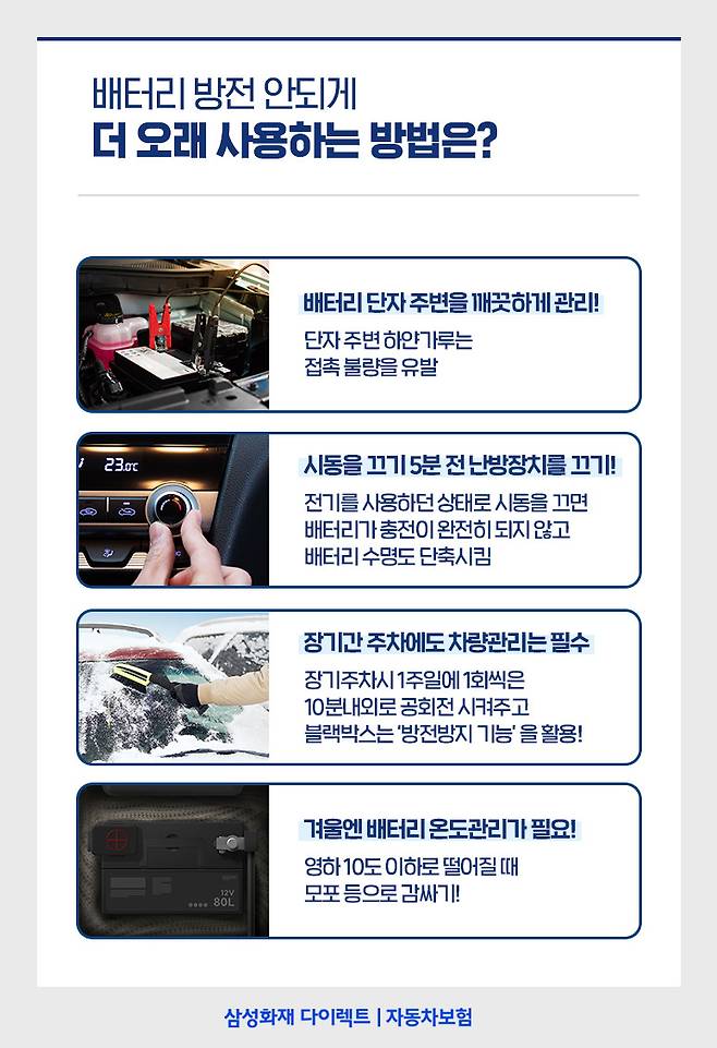 자동차 배터리는 약 2년 주기로 교체하는 것이 제일 좋습니다. 날씨가 추워지고 있는 요즘 미리 배터리 점검하여 불시에 배터리 방전되는 일을 예방하면 어떨까요?