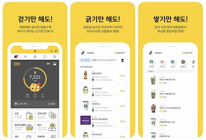 ☞ 장점 : 가장 유명한 만보기 어플 중 하나로 타 어플 대비 가장 다양한 기프티콘을 보유하고 있다. 또한 스마트폰 락 화면으로 지정이 가능하여 매일 잊지 않고 캐시를 챙길 수 있다.