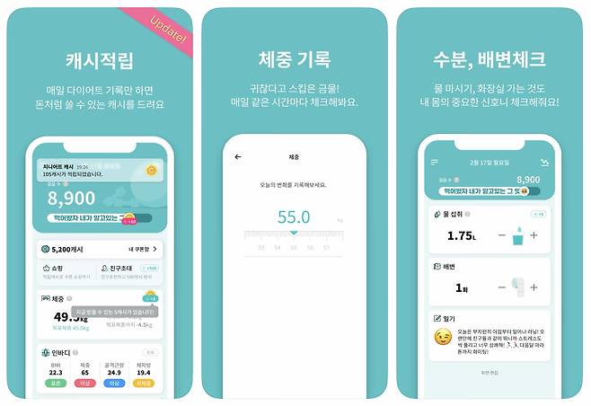 : 다이어트 어플 기반의 리워드 앱. 걷기 외에도 [체중 기록], [식단 기록], [인바디 기록], [용돈 퀴즈] 등을 통하여 추가 적립이 가능하다. 적립된 포인트는 [쇼핑] 탭을 통해 사용할 수 있다.