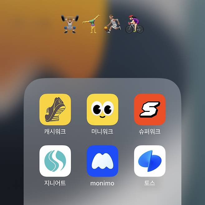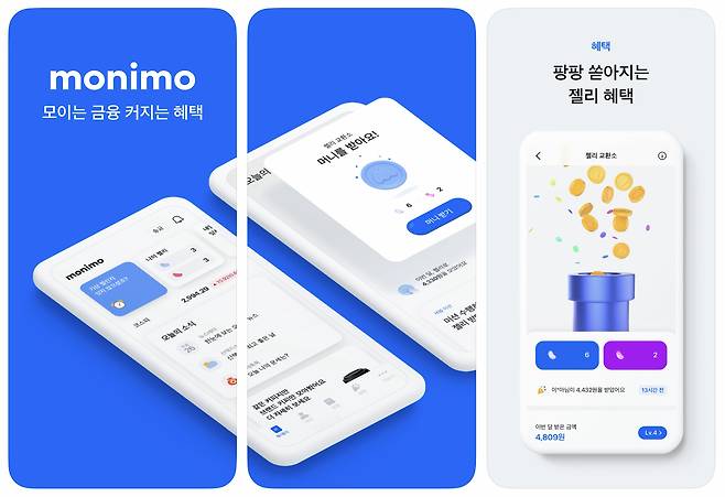 : 삼성금융(삼성화재, 삼성생명, 삼성카드, 삼성증권)이 모여 탄생한 '모니모' 앱. 매월 일정 기간 동안 모집하는 '챌린지' 중 하나인 '걷기 챌린지'를 통하여 걷기 리워드 적립이 가능하다. 하루 5천 보 기준 젤리 1개(10원~50원의 가치) 지급 + 10일 연속 달성 시 젤리 1개 추가 지급, 30일 연속 달성 시 스페셜 젤리 1개(1,000원~3,000원의 가치) 지급된다.