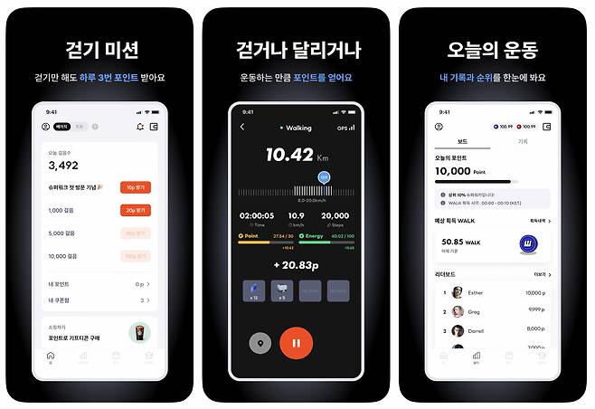 : 국내 M2E(Move to Earn, 돈 버는 운동) 블록체인 기반의 걷기 리워드 앱. '베이직', '프로' 모드로 사용 가능하며 '베이직' 모드를 통해 걷기 적립이 가능하다. '프로' 모드의 경우 NFT 운동화를 구입 후 걷기 운동을 하면 속도, GPS, 보유 신발 상태에 따라 코인 채굴까지 가능하다. 포인트는 [쇼핑하기] 탭을 통해 다양한 기프티콘으로 교환이 가능하다.