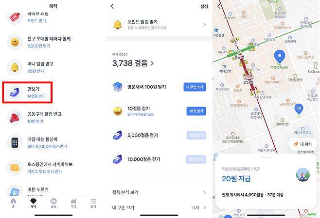 : 토스 앱 내 [혜택]-[만보기] 탭을 통하여 방문할 수 있는 페이지. 1,000걸음 시 10원, 5,000걸음 시 10원, 10,000걸음 시 20원을 받을 수 있으며 내 주변 미션 지역을 방문하면 최대 100원까지 추가 적립이 가능하다. (1일 기준 최대 140원까지 적립 가능) 적립된 포인트는 기프티콘으로 교환 혹은 현금으로 출금이 가능하다.