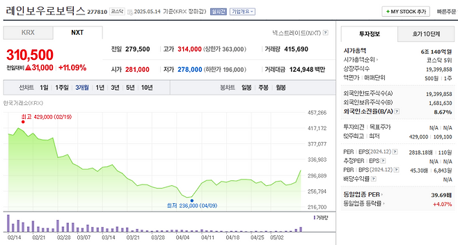 연초 뜨겁다가 4월 초 반 값으로 조정을 받은 레인보우로보틱스도 같이 시동을 겁니다. 인공지능이 검색만으로 끝나는 것이 아니라 인공지능을 가진 휴머노이드 로봇으로 가야하기 때문입니다.