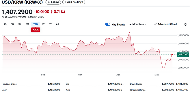 달라 대비 원화 환율은 연초에 비해 4.3% 내려왔습니다. 미중 관세 유예 발표 이후 약간은 달라 가치가 올랐지만 최근 한미 재정 당국이 원화가 너무 싸다가 그 가치를 낮추어야 한다는 협의를 하였다는 소식이 들립니다.