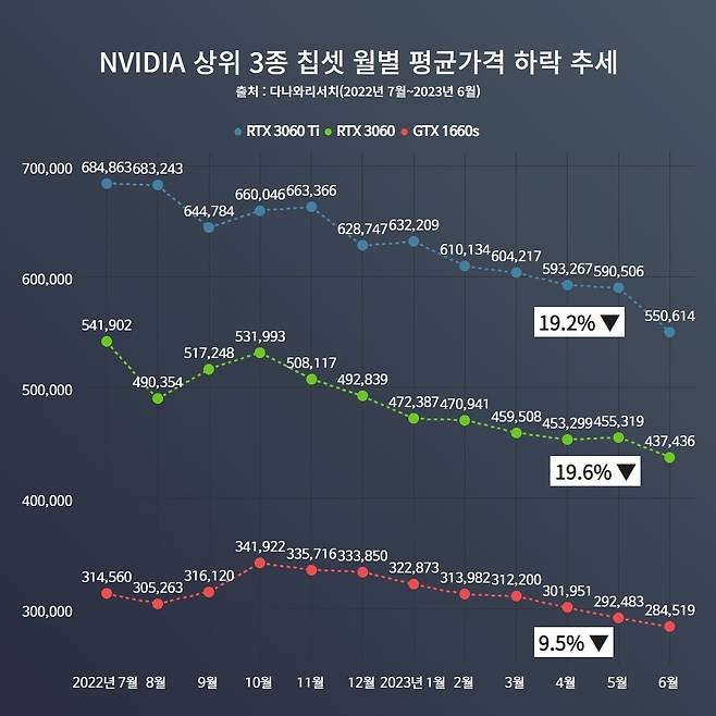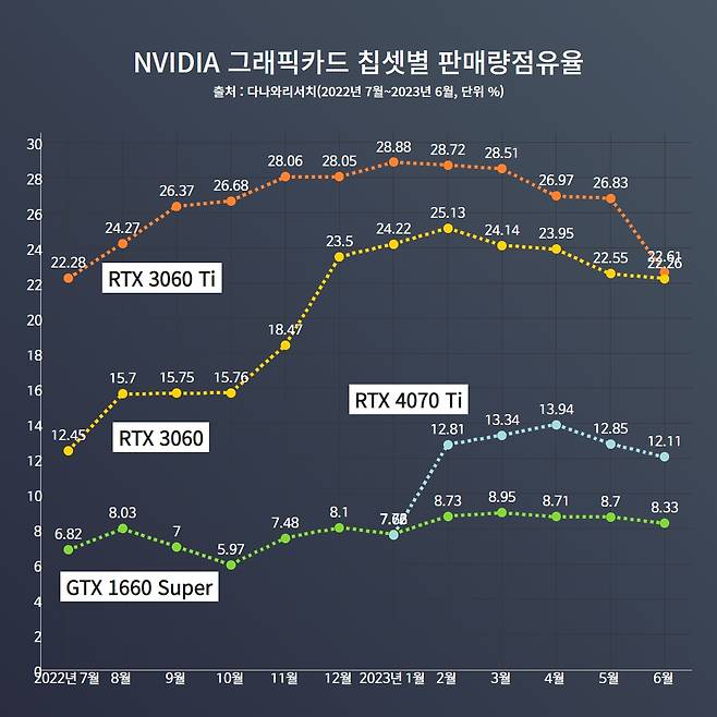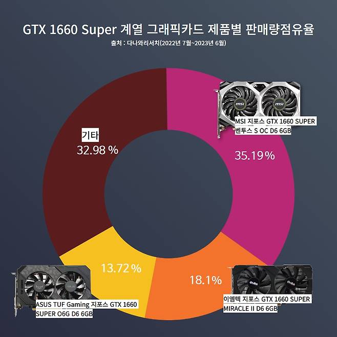이는 GTX 1660 Super의 가격 경쟁력이 계속 유지되기 때문이다. 2023년 6월 기준으로 GTX 1660은 RTX 3060 Ti 가격의 51.6% 정도에 불과하다. 즉 20만 원대의 가격을 유지해 보급형 게이밍 PC 수요에 대응할 수 있다. 또한, RTX 4070 Ti의 판매량이 상승하고 있어 RTX 30 시리즈의 대체 수요로 작용하지만, 보급형 게이밍 PC에 주로 사용되는 GTX 1660 Super가 RTX 40 시리즈의 소비자층과 딱히 겹치지 않기에 판매량 점유율을 계속 유지할 것으로 예상된다.