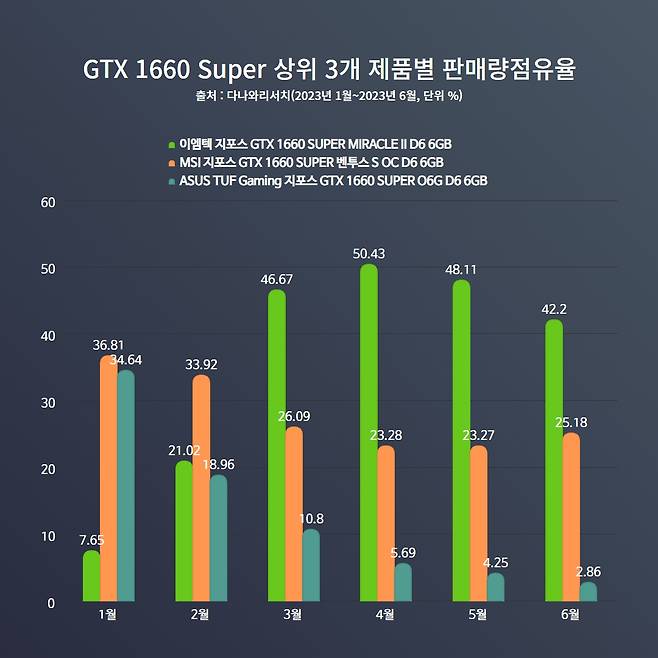하지만, 2023년 상반기 상위 3개 제품별 판매량 점유율 변화를 보면 MSI와 이엠텍 제품의 자리바꿈이 어느정도 예견된다. 2023년은 1월에 출시된 이엠텍 지포스 GTX 1660 SUPER MIRACLE II D6 6GB는 3월부터 판매량 1위 자리를 탈환하고 최근까지 계속 유지하고 있다. 이는 이엠텍의 전략이 제대로 먹혀들어갔기 때문이다.