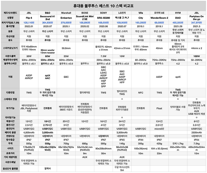 현재 판매되고 있는 휴대용(배터리 내장) 블루투스 스피커 중 인기 있는 10종에 대해 살펴 보았다. 오디오는 같은 유닛을 사용하고 있더라도 제품 바디의 종류와 설계, 튜닝에 따라 천차만별로 소리가 달라진다. 위에 소개 했던 10종의 스피커 또한 정말 각양각색의 소리를 들려주었으며, 어떤 제품은 디자인과 마감이 뛰어나지만 소리가 좋지 않았고 어떤 제품은 소리는 좋지만 디자인이 별로인 제품도 있었다. 역시 이 가격대에서 선택의 초점은 역시 예쁜 디자인이지만 이 리뷰를 참고하여 개인의 취향에 맞는 디자인 중 좋은 음질을 내어주면서 가격이 저렴한 제품을 선택하는것이 좋겠다.