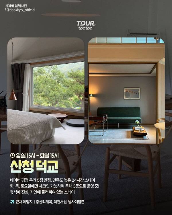 산청 덕교는 화·목·토요일에만 체크인이 가능합니다. 무엇보다도 '휴식'에 진심인 펜션이니 창밖의 자연과 지금 이 순간의 '나'에게 온전히 집중해보는 시간을 가져보세요.