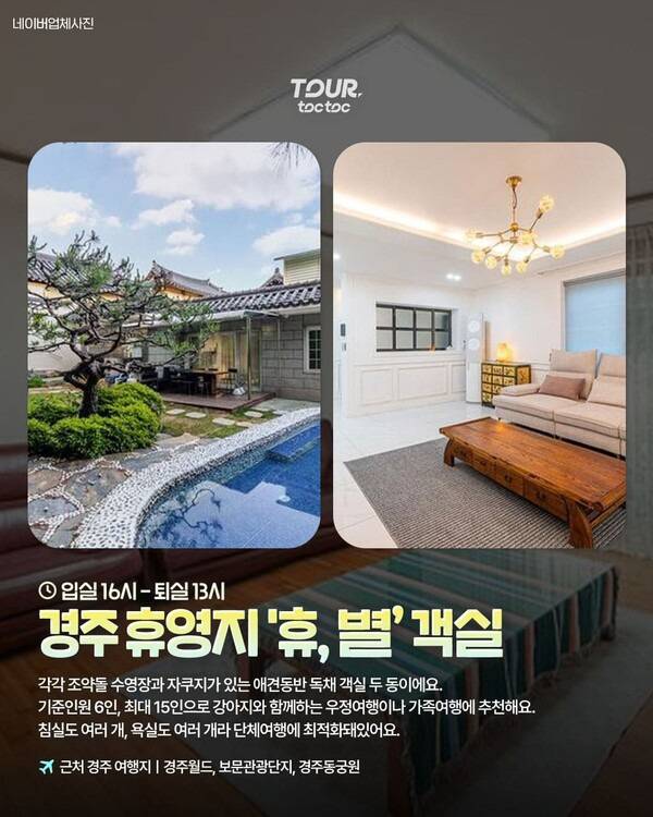 경주 보문관광단지의 애견동반 숙소 경주 휴영지입니다. 여러 객실 중에서도 '휴' 객실과 '별' 객실은 오후 1시 퇴실로 운영되고 있어 여유로운 오전 시간을 보내기 좋은데요. 두 객실의 기준인원은 최소 6인, 최대 15인으로 강아지를 동반한 우정여행이나 대가족 여행에 추천하는 늦은 퇴실 숙소입니다.